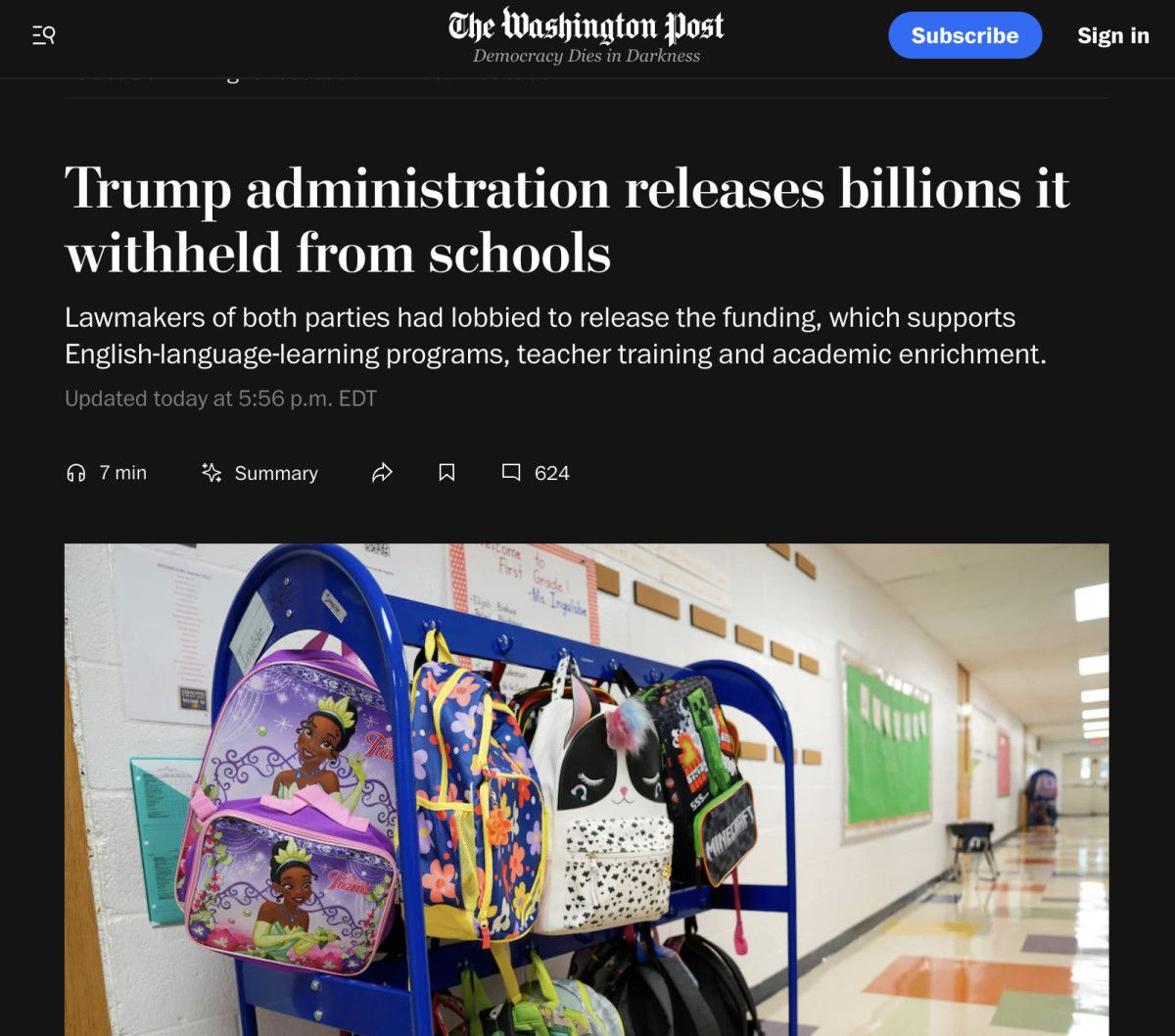 Karar, İngilizce öğrenme desteği, göçmen çocuklara yönelik programlar, yaz okulları ve öğretmen eğitimlerini hedef aldı. Fonun dondurulması, ülke genelindeki 600’den fazla okul bölgesini etkiledi. Okul yöneticileri, bazı programların kapanacağını ve öğretmen çıkarımlarının gündeme geldiğini söyledi. AASA’nın yaptığı ankete göre, süperintendentlerin yüzde 85’i bu kaynaklarla yapılmış ödemesi gereken sözleşmelere sahipti.