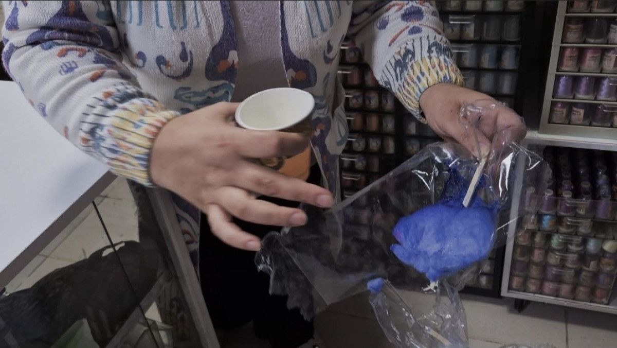 Anne Ulufer, pamuk şekere su döktüğünde ortaya çıkan yoğun ve masmavi boyayı görünce durumu cep telefonuyla görüntüledi.