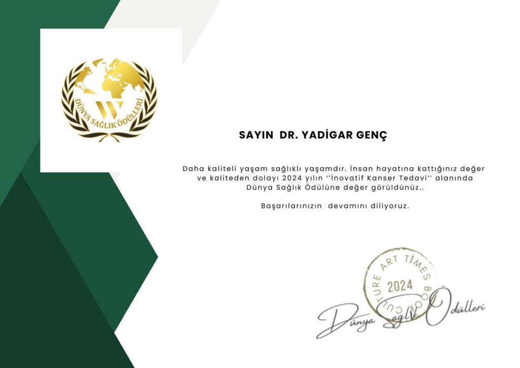 Dünya Sağlık Ödüllerin de İnovatif kanser tedavilerinde başarı ödülü alan Yadigar Genç, kanserle mücadele de en başarılı doktorlar arasında gösteriliyor. Dr. Genç, kanser tedavilerinde geliştirdiği İnovatif tedavi ve Lazerle tedavi konusunda dünyanın en iyi 7 doktoru arasında gösterilmekte.