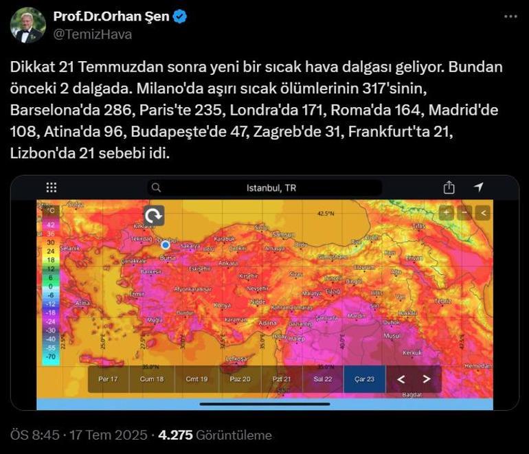 Dikkat! 21 Temmuzdan sonra yeni bir sıcak hava dalgası geliyor. Bundan önceki 2 dalgada, Milano’da aşırı sıcak ölümlerinin 317’sinin, Barselona’da 286, Paris’te 235, Londra’da 171, Roma’da 164, Madrid’de 108, Atina’da 96, Budapeşte’de 47, Zagreb’de 31, Frankfurt’ta 21, Lizbon’da 21 sebebiydi.