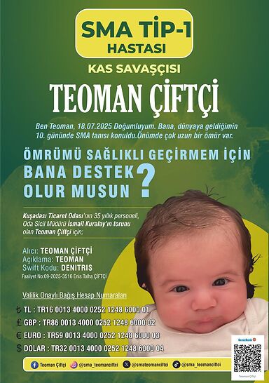 HABER MERKEZİ- Aydın’ın Kuşadası ilçesinde 2,5 aylık bir bebeğin yaşam ile ölüm arasındaki mücadelesi ibretle izleniyor. İlçede ikamet eden Yağmur-Enis Talha Çiftçi çiftinin henüz 10 günlükken SMA tanısı konan bebekleri Teoman’ın yaşamı, Sağlık Bakanlığı’nın ödeme yapmadığı ilaçların alınmasına, yani hayırseverlerin yardımına bağlı. Doktorların, kas kayıpları kalıcı olmasın diye “6 aylık olmadan ilacına kavuşması şart” dediği minik Teoman için 1 milyon 817 bin dolar toplanması gerekiyor. Ailenin Aydın Valiliği’nden aldığı ‘Yardım toplama iznine ait kimlik belgesi’ bulunuyor, yardım toplama izin no’su ise 09-2025-3616. Minik Teoman’ın hayata tutunması ve uzun bir ömür yaşaması için destek olmak isteyen hayırseverler Aydın Valiliği yetkilileri ile görüşerek arzu ettikleri miktarda bağışta bulunabiliyor.