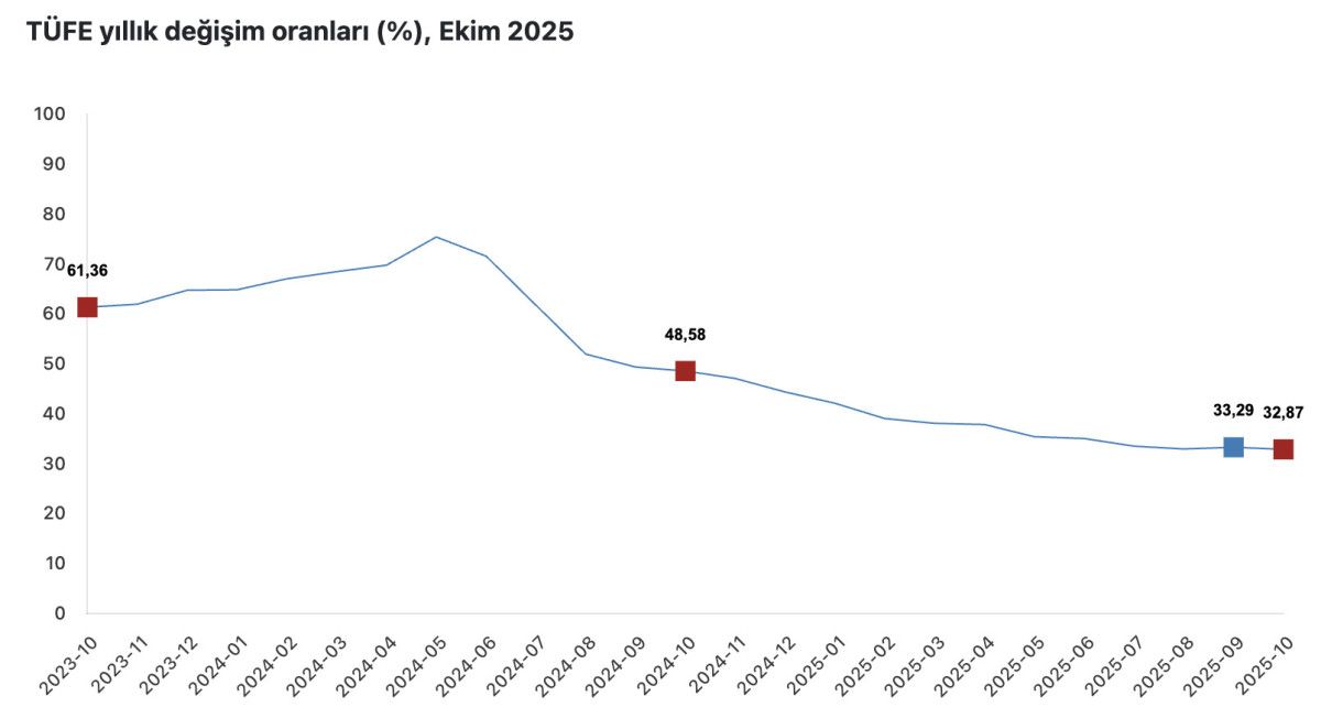 TÜFE’deki değişim 2025 yılı Ekim ayında; bir önceki aya göre yüzde 2,55 artış, bir önceki yılın Aralık ayına göre yüzde 28,63 artış, bir önceki yılın aynı ayına göre yüzde 32,87 artış ve on iki aylık ortalamalara göre yüzde 37,15 artış olarak gerçekleşti.