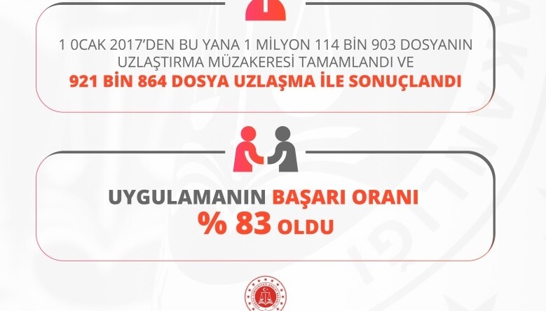 Adalet Bakanlığı verilerine göre bu güne kadar 1 milyon 114 bin 903 dosyanın uzlaştırma müzakeresi tamamlandı ve 921 bin 864 dosya uzlaşma ile sonuçlandı. Böylece müzakere edilen ve başarıyla tamamlanan dosyalarda başarı oranı yüzde 83 oldu.